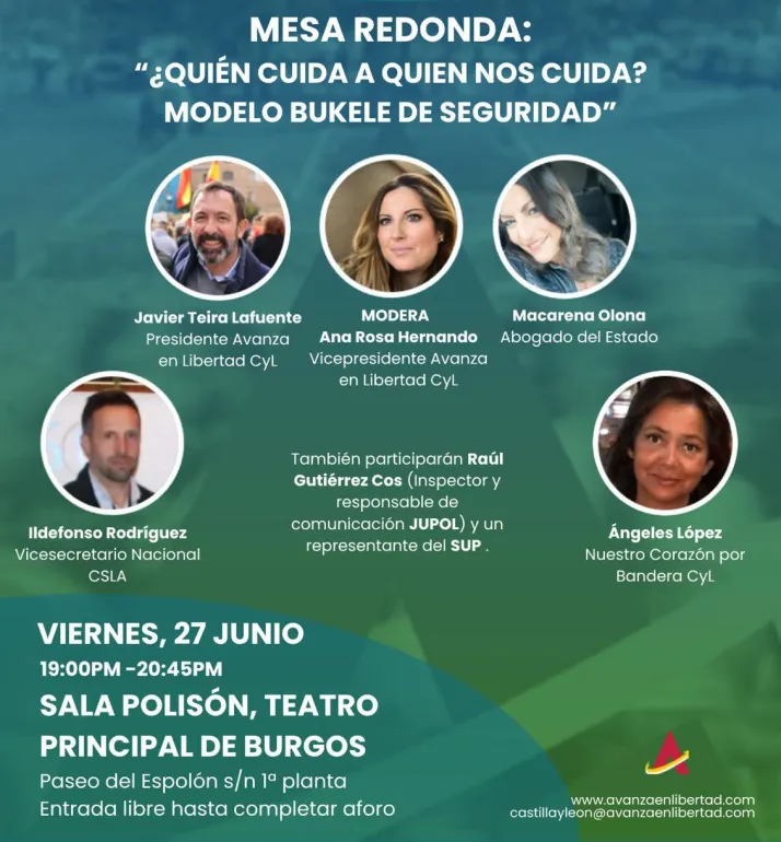 El próximo 27 de junio, las directivas y delegaciones de los diferentes puntos de España se reunirán en Burgos para asistir a la celebración de la mesa redonda titulada"¿Quién cuida a quién nos cuida? Modelo Bukele de Seguridad", que contará como ponentes con la abogada del estado Macarena Olona, el vicesecretario nacional de CSLA Ildefonso Rodríguez, la delegada de Nuestro Corazón por Bandera en Castilla yLeón, Ángeles López, y miembros de los sindicatos policiales SUP y JUPOL.