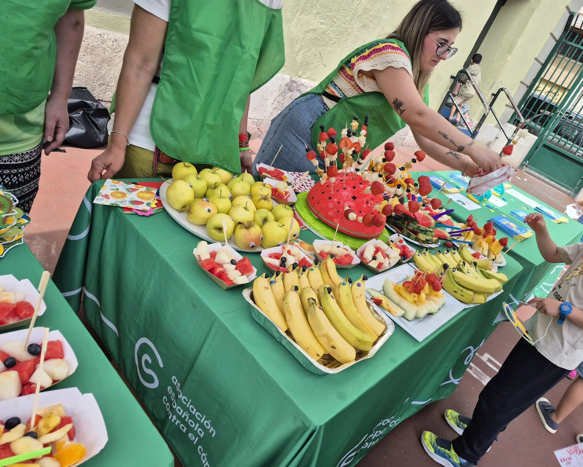 Los voluntarios y voluntarias de la Asociación han estado desde primera hora de la mañana cortando fruta fresca con esmero y diseñando las divertidas presentaciones para los pequeños, tematizando las mesas y creando un diseño visual que ha captado la atención desde el primer momento.