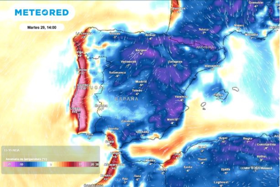 Por otra parte, el ascenso hacia el norte del anticiclón de las Azores ayudará a que los vientos predominantes sean en el norte y noreste en la geografía peninsular y en el archipiélago balear. El modelo europeo anticipa que las temperaturas pueden situarse entre 3 y 6 ºC por debajo de las medias de las fechas en zonas del valle del Ebro, este de Castilla y León, La Rioja, Navarra y en puntos del Pirineo.