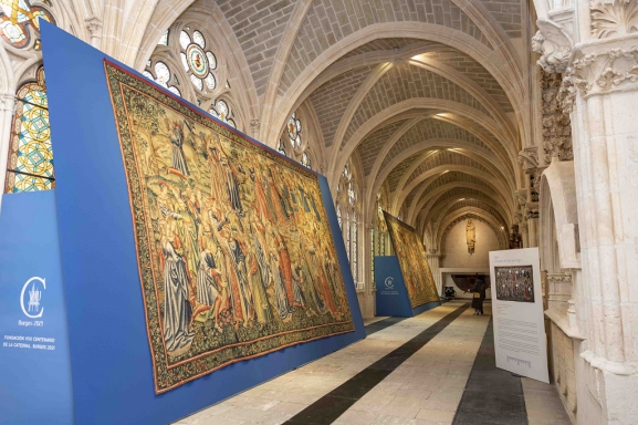 El claustro alto exhibe los tapices restaurados de la colección Gótico-FlamencaDel importante conjunto de tapices flamencos de los siglos XVI y XVII de la Catedral de Burgos brilla la colección Gótico-Flamenca y Teológica. De ella, Crucifixión y las virtudes ganan la batalla a los vicios, uno de los paños legados por el obispo Juan Rodríguez de Fonseca, acaba de ser restaurado por el taller de Pepa Garrido bajo el mecenazgo de la Fundación VIII Centenario de la Catedral. Burgos 2021. Esta pieza fue tejida en un taller bruselense con cartones de Colijn de Cooter.