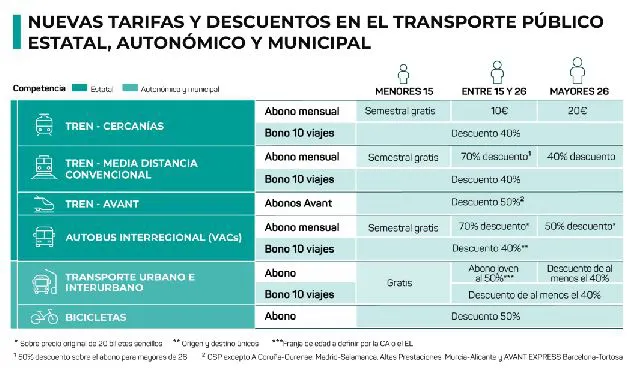 De manera general, se contempla un billete único de Cercanías para todas las zonas y núcleos de España por 20 euros al mes, la gratuidad de todo el transporte público colectivo para menores de 15 años, descuentos especiales para jóvenes, tarifas más reducidas para el resto de usuarios recurrentes y nuevas ayudas para promover el uso de la bicicleta como medio de transporte cotidiano.
